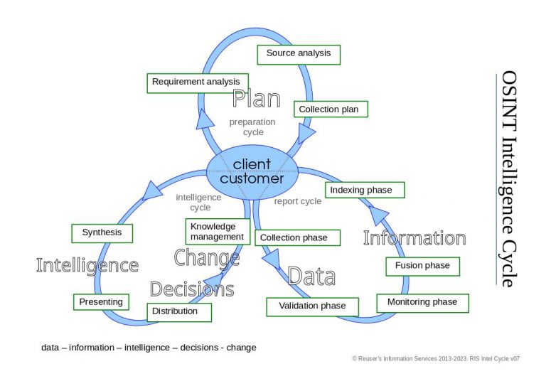 intelligence production cycle that at least for Open Source Intelligence processes works much better, where the customer is in the middle, the phrase “analysis” replaced by “synthesis”, and where the production speeds is seriously increased